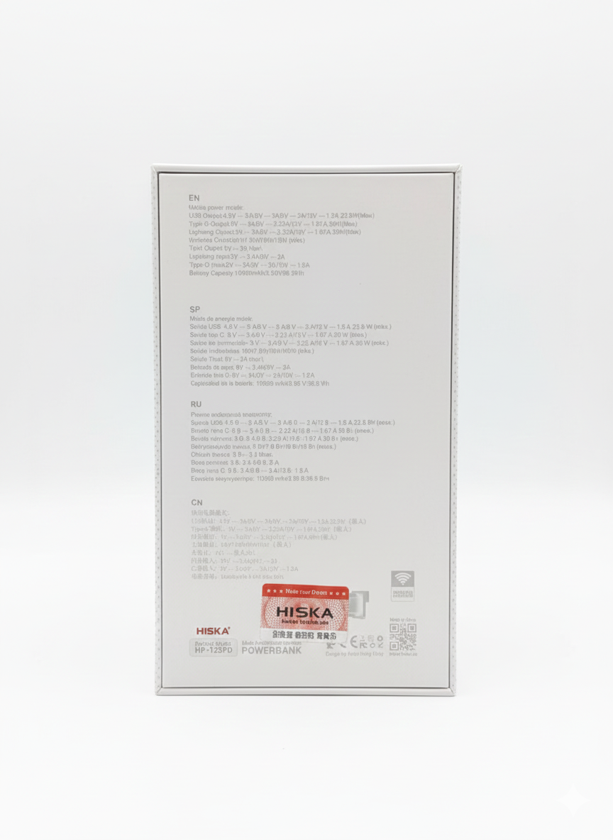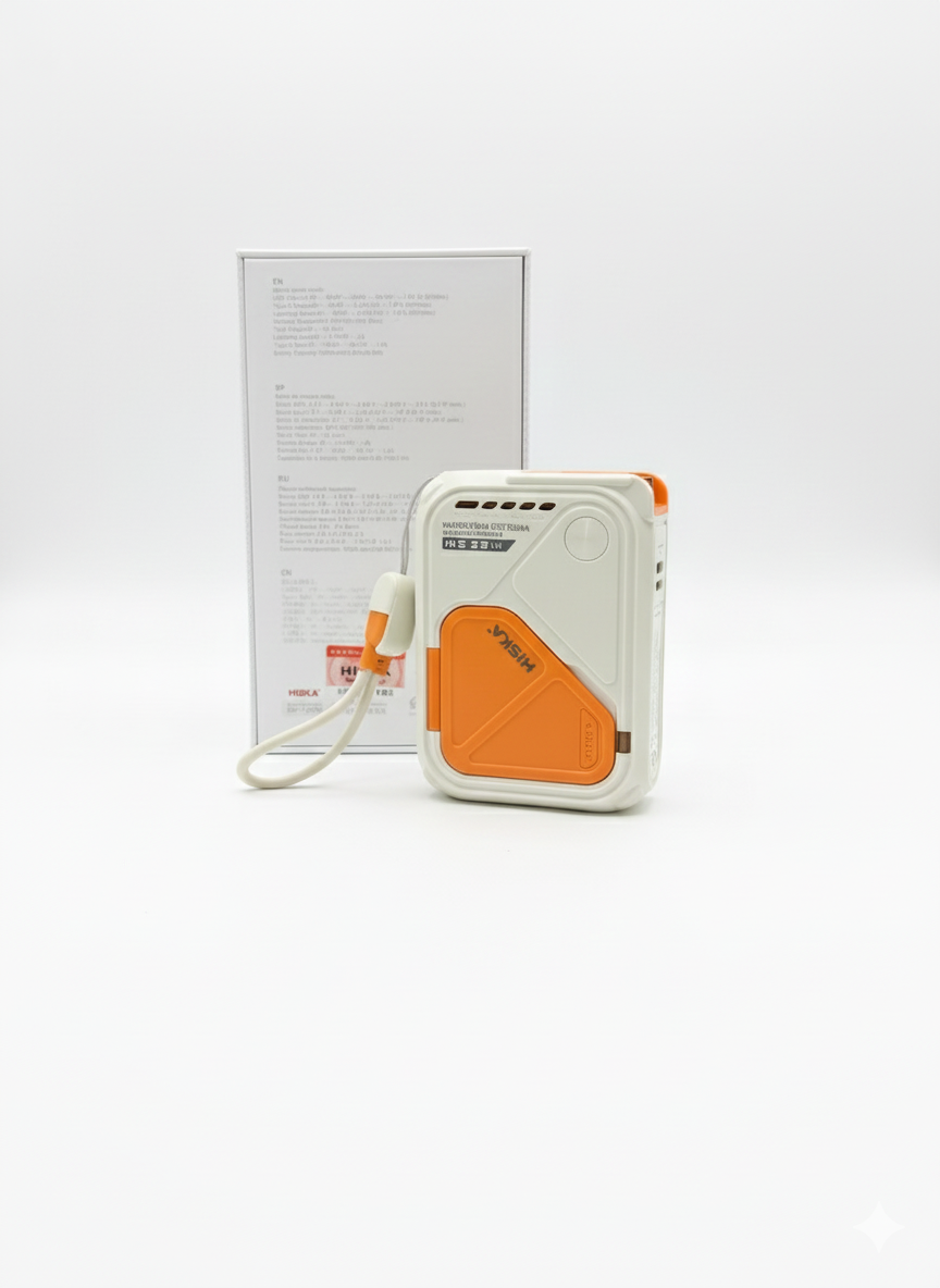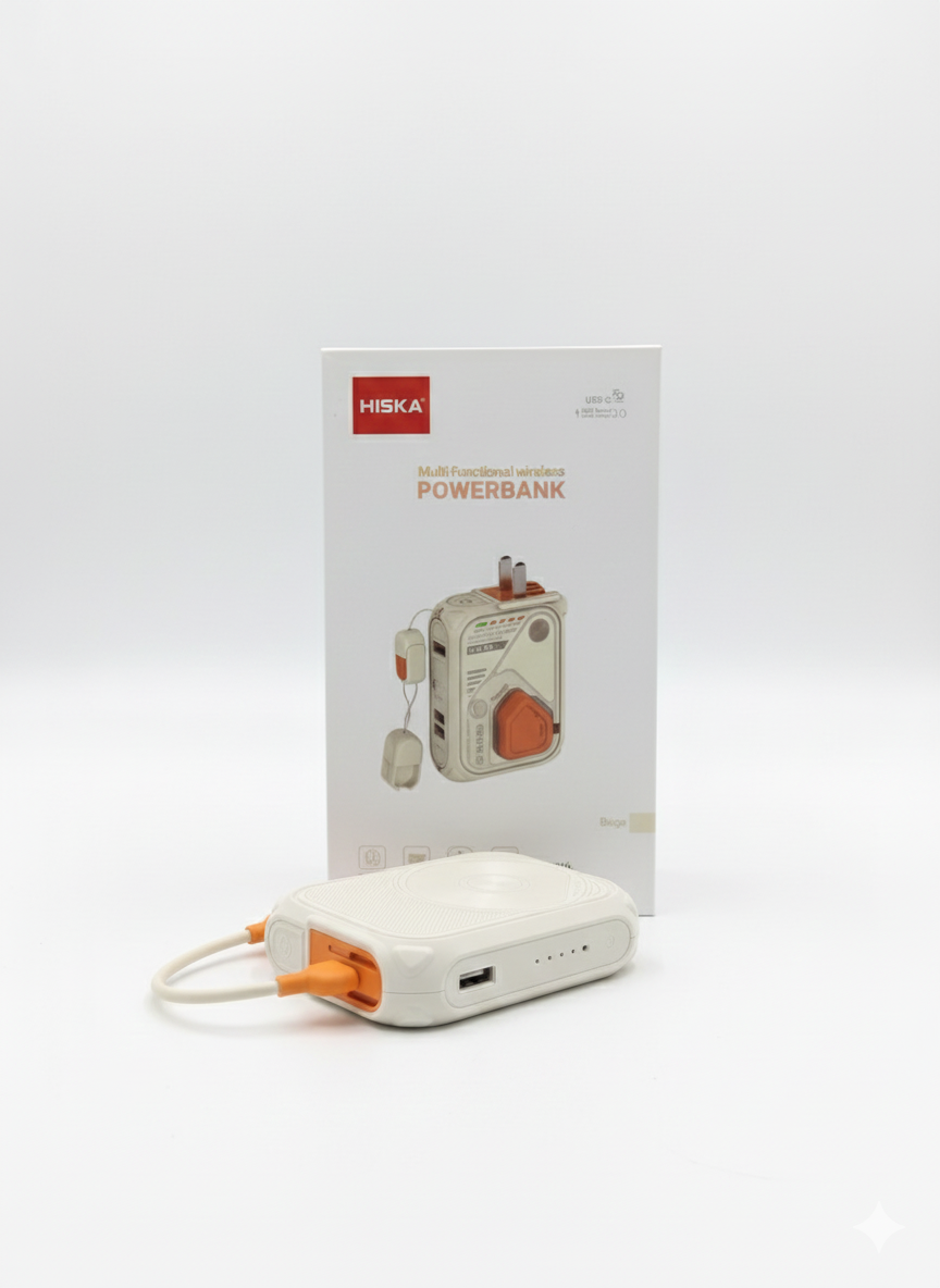 این محصول، پاوربانک بیسیم HISKA مدل HP-123PD است که به عنوان یک دستگاه چندمنظوره برای شارژ سریع و قابلحمل طراحی شده است. این پاوربانک با ظرفیت 10000 میلیآمپرساعت و ولتاژ 3.85 ولت، توانایی ارائه خروجیهای متنوع و قدرتمند برای انواع دستگاههای الکترونیکی را دارد. پاوربانک دارای چندین پورت خروجی است که شامل پورت USB با توان حداکثری 22.5 وات، پورت Type-C با توان حداکثری 20 وات، و خروجی Lightning با توان مشابه میشود. همچنین این دستگاه از قابلیت شارژ بیسیم با توانهای مختلف 5 وات، 7.5 وات، 10 وات و 15 وات پشتیبانی میکند، که آن را برای شارژ گوشیهای هوشمند مجهز به فناوری شارژ بیسیم بسیار مناسب میسازد. این پاوربانک از شارژ سریع ورودی نیز پشتیبانی میکند و از طریق پورتهای Lightning و Type-C میتواند با سرعت بالا شارژ شود. طراحی دستگاه به گونهای است که شاخههای برق داخلی آن جمعشونده بوده و در صورت نیاز برای اتصال مستقیم به پریز برق آماده میشوند، که این ویژگی به شما امکان استفاده مستقیم به عنوان یک شارژر دیواری را نیز میدهد. سطح دستگاه با روکشی به رنگ سفید و نارنجی طراحی شده که علاوه بر زیبایی، دوام و کاربری آسانی را ارائه میدهد. نشانگرهای LED تعبیهشده روی بدنه میزان شارژ باقیمانده باتری را نشان میدهند. این پاوربانک با پشتیبانی از فناوریهای مختلف نظیر Qualcomm Quick Charge 3.0 و Power Delivery، کارایی و انعطافپذیری بالایی را به کاربران ارائه میدهد.